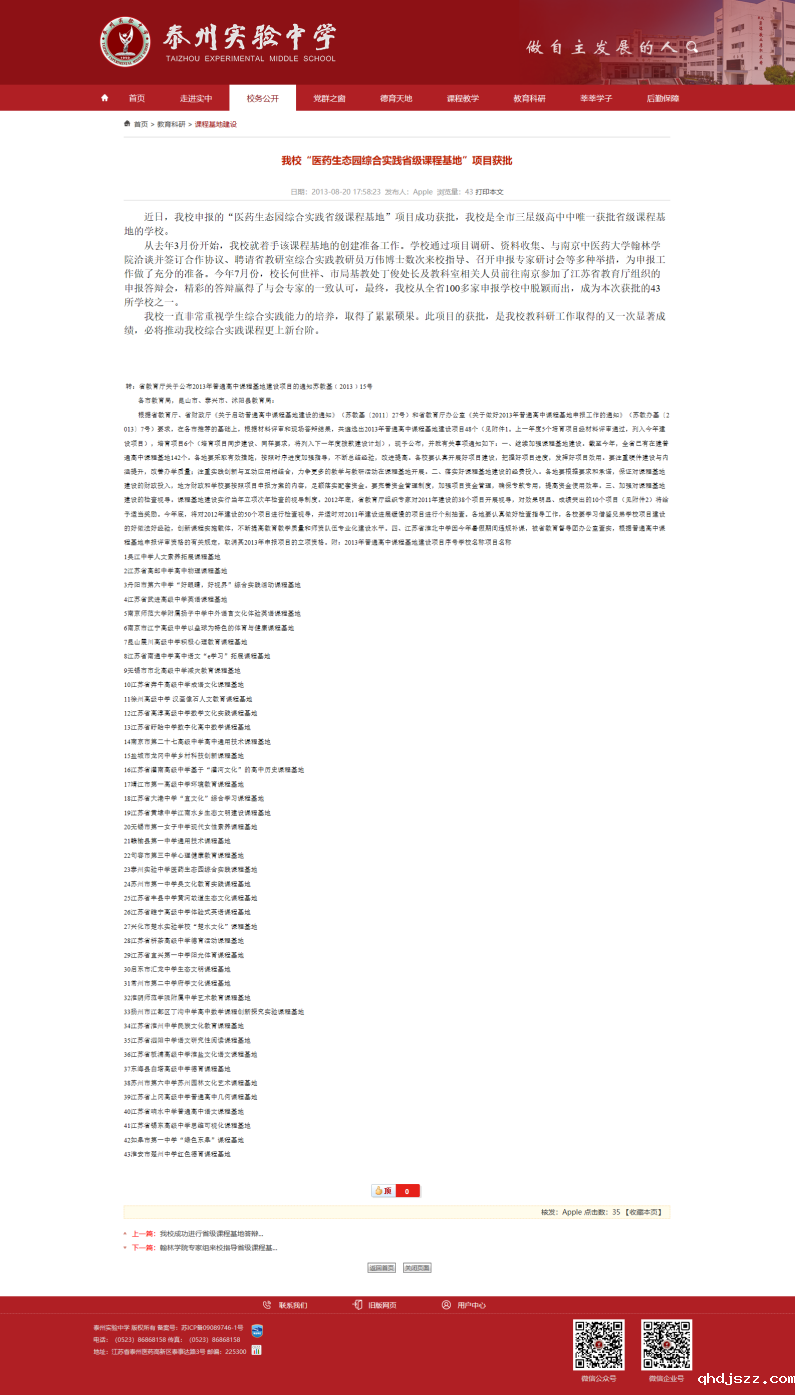 6、学校逐步实现优质特色发展,产生了一定的社会影响。学校建设这一课程基地主要目的是服务地方经济发展,培养学生学习兴趣,为学生未来成长打基础。学校通过建设课程基地也能实现自身特色,医药特色课程将成为我校继主体参与课堂教学模式、体验式学习方式之后又一张学校品牌。泰州市王学锋副市长及市教育局领导等曾来校察看中草药种植和课程基地建设工作,并为建设骨干教师队伍作专门批示;《泰州晚报》、泰州教育网等多家媒体也多次报道课程基地建设情况。“本草园”之DIT被评为泰州市教育“微创新”案例。