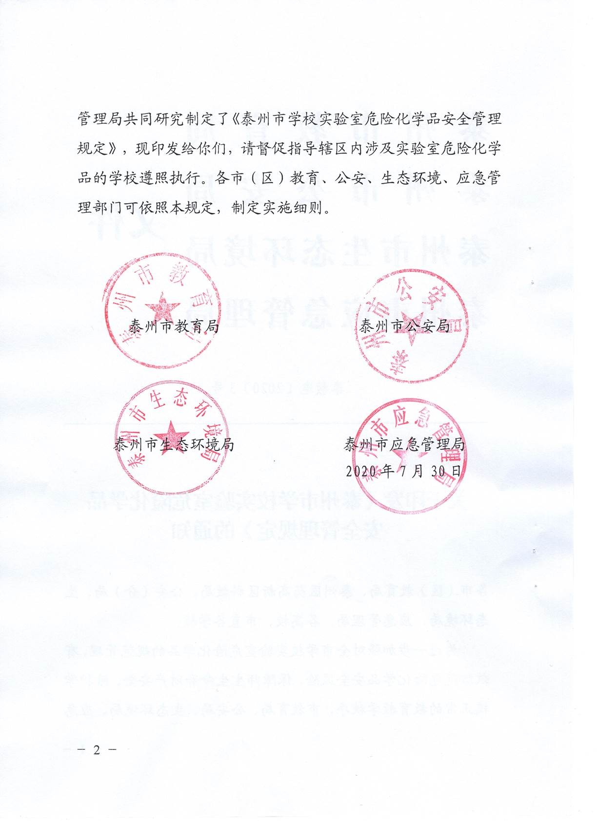 为进一步加强对全市学校实验室危险化学品的规范管理,有效防范危险化学品安全风险,保障师生生命和财产安全,维护学校正常的教育教学秩序,市教育局、公安局、生态环境局、应急管理局共同研究制定了《泰州市学校实验室危险化学品安全管理规定》,现印发给你们,请督促指导辖区内涉及实验室危险化学品的学校遵照执行。各市(区)教育、公安、生态环境、应急管理部门可依照本规定,制定实施细则。