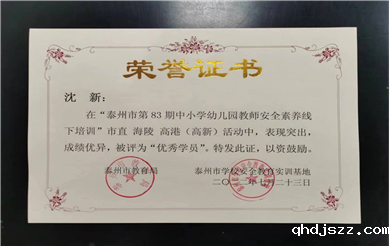 7月20日至7月23日,我校部分教师参加泰州市第八十三期中小学幼儿园教师安全素养培训。其中沈新老师被评为优秀学员。