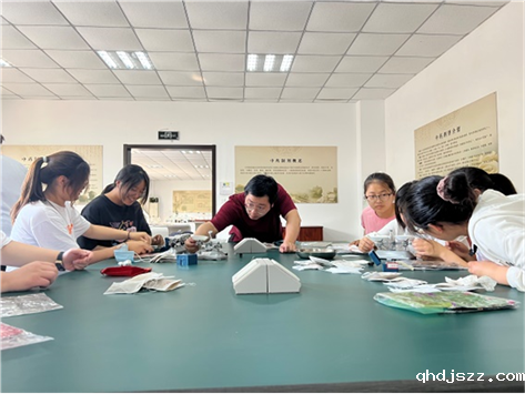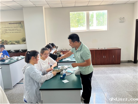 陈璟和单鑫两位老师为学生讲授香囊的制作过程并指导学生进行手工香囊的制作。刘晨老师指导学生进行常见中药材的鉴定。