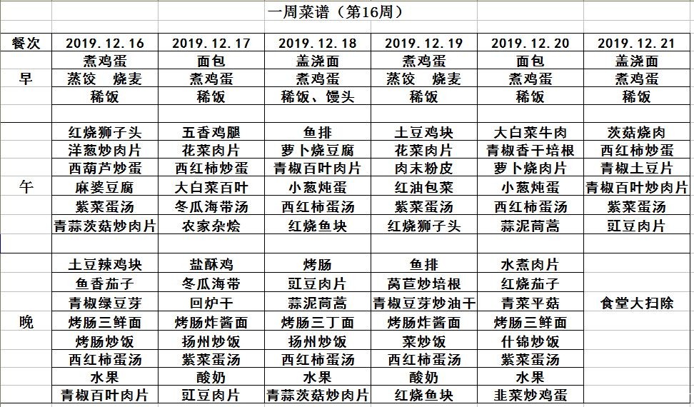 19年秋学期第16周菜谱